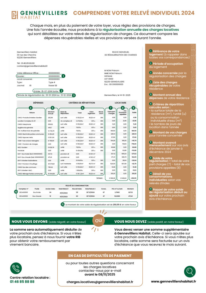 Chaque mois, en plus du paiement de votre loyer, vous réglez des provisions de charges. Une fois l’année écoulée, nous procédons à la régularisation annuelle des charges locatives qui sont détaillées sur votre relevé de régularisation de charges.